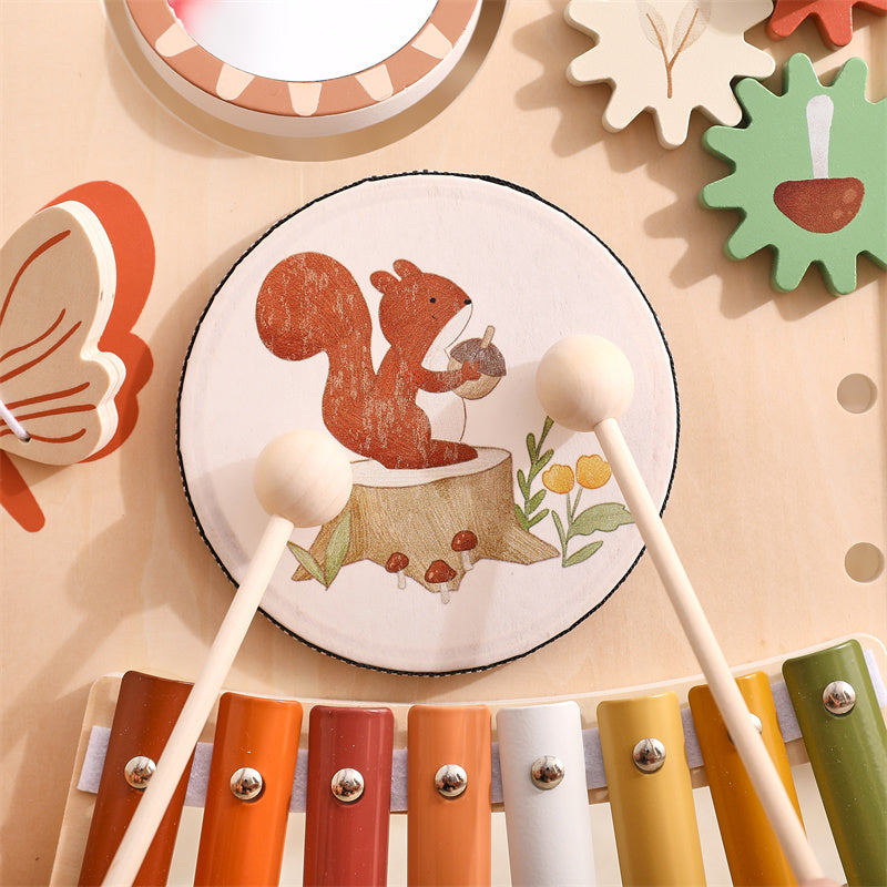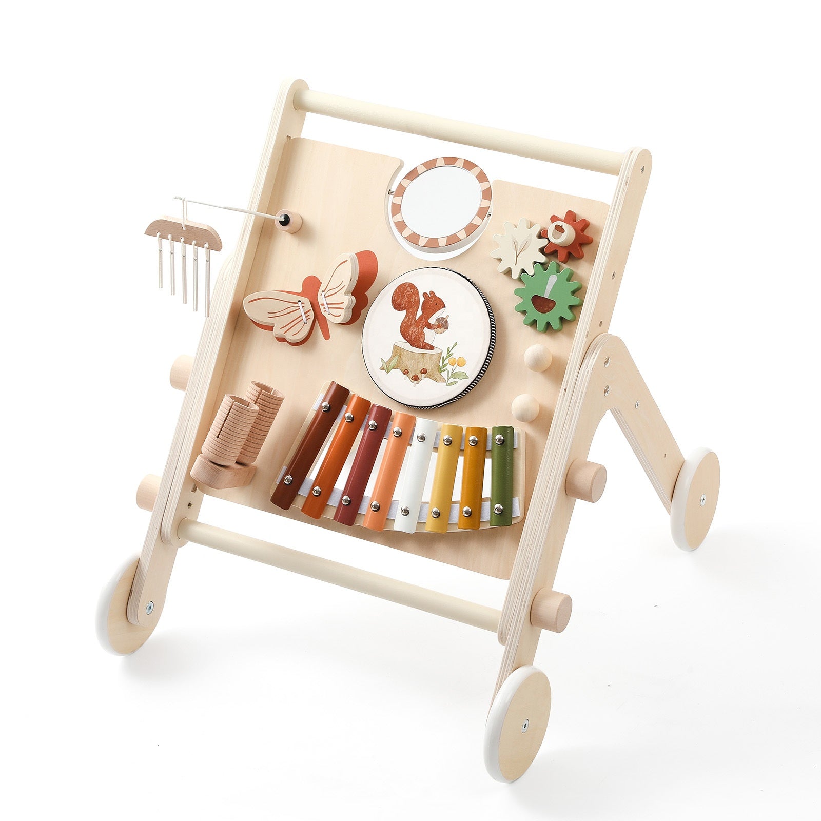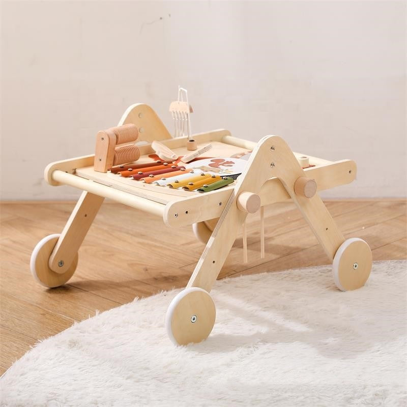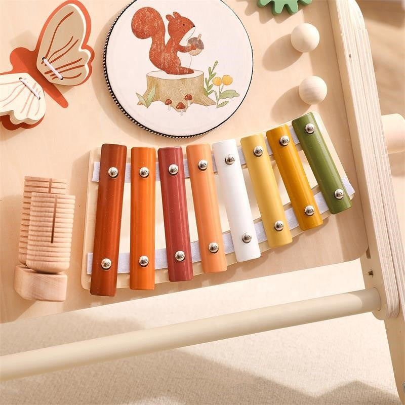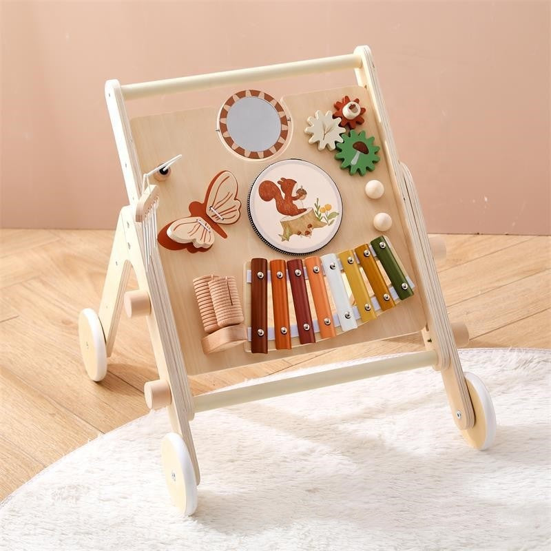- Centro de actividades multifuncional: Incluye un tablero musical que permite al niño realizar diferentes acciones y producir distintos sonidos, estimulando la coordinación mano-ojo y la motricidad fina.