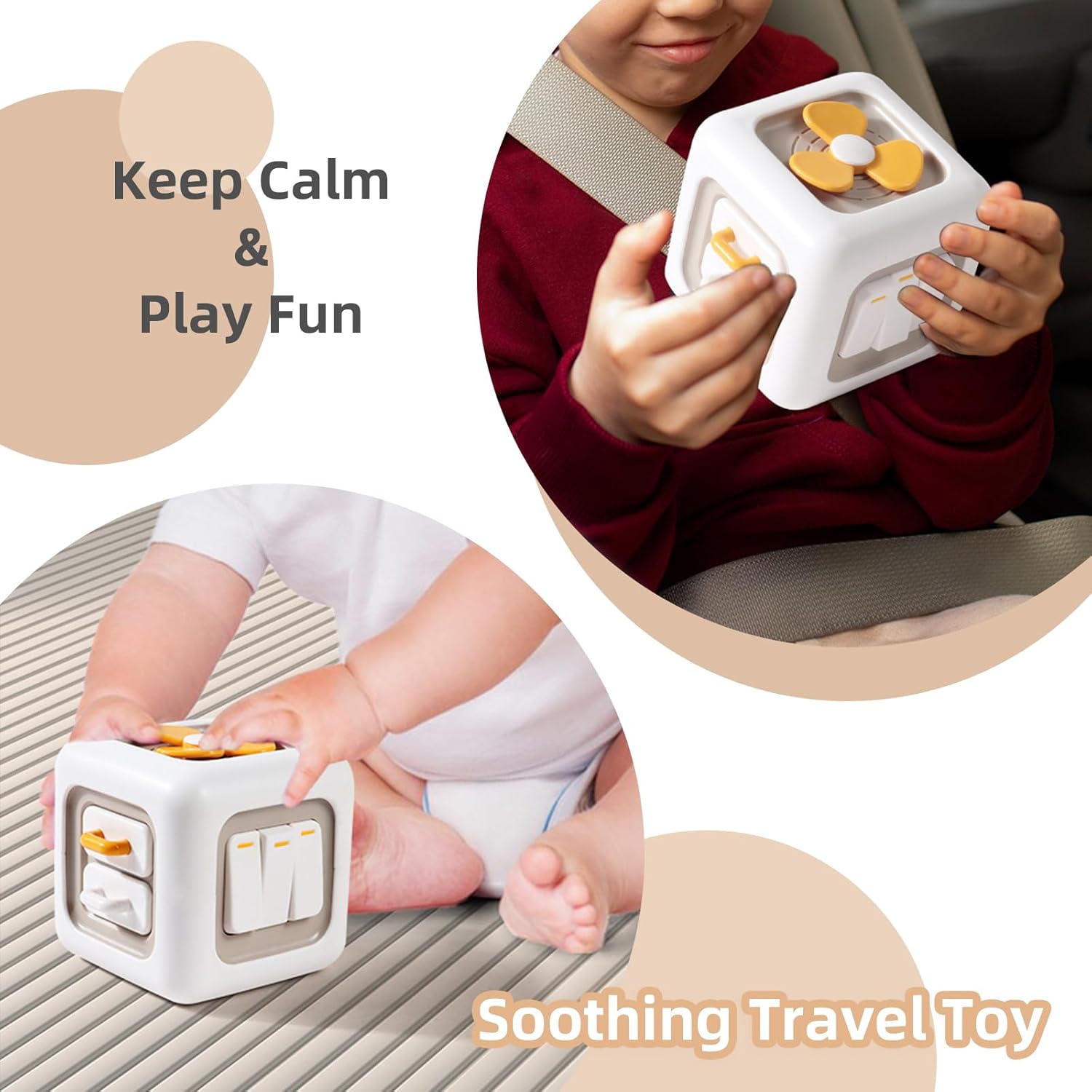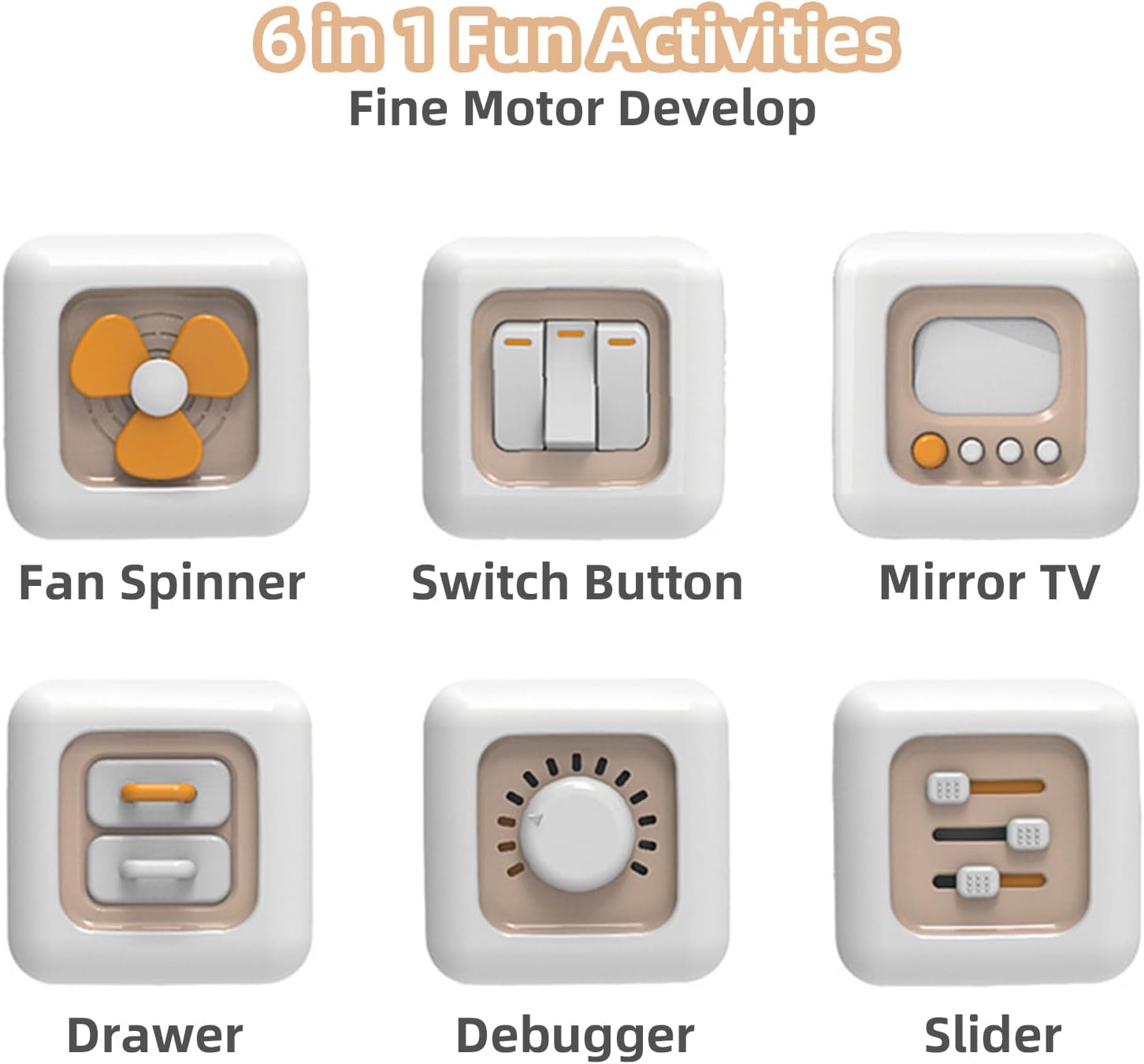 - Diseñado con 6 paneles interactivos, incluye ventilador giratorio, espejo, interruptor, cajón con cierre, perillas y deslizadores.