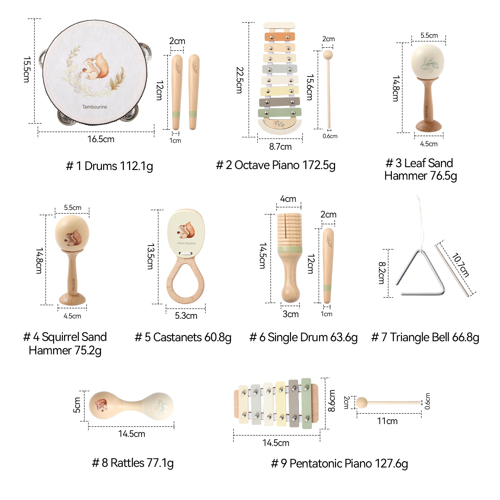 - Exploración sonora y sensorial: Incluye 9 instrumentos de madera diferentes —como xilófono, tambor, maracas, pandereta, claves y más— que permiten al niño experimentar con distintos ritmos, tonos y texturas.