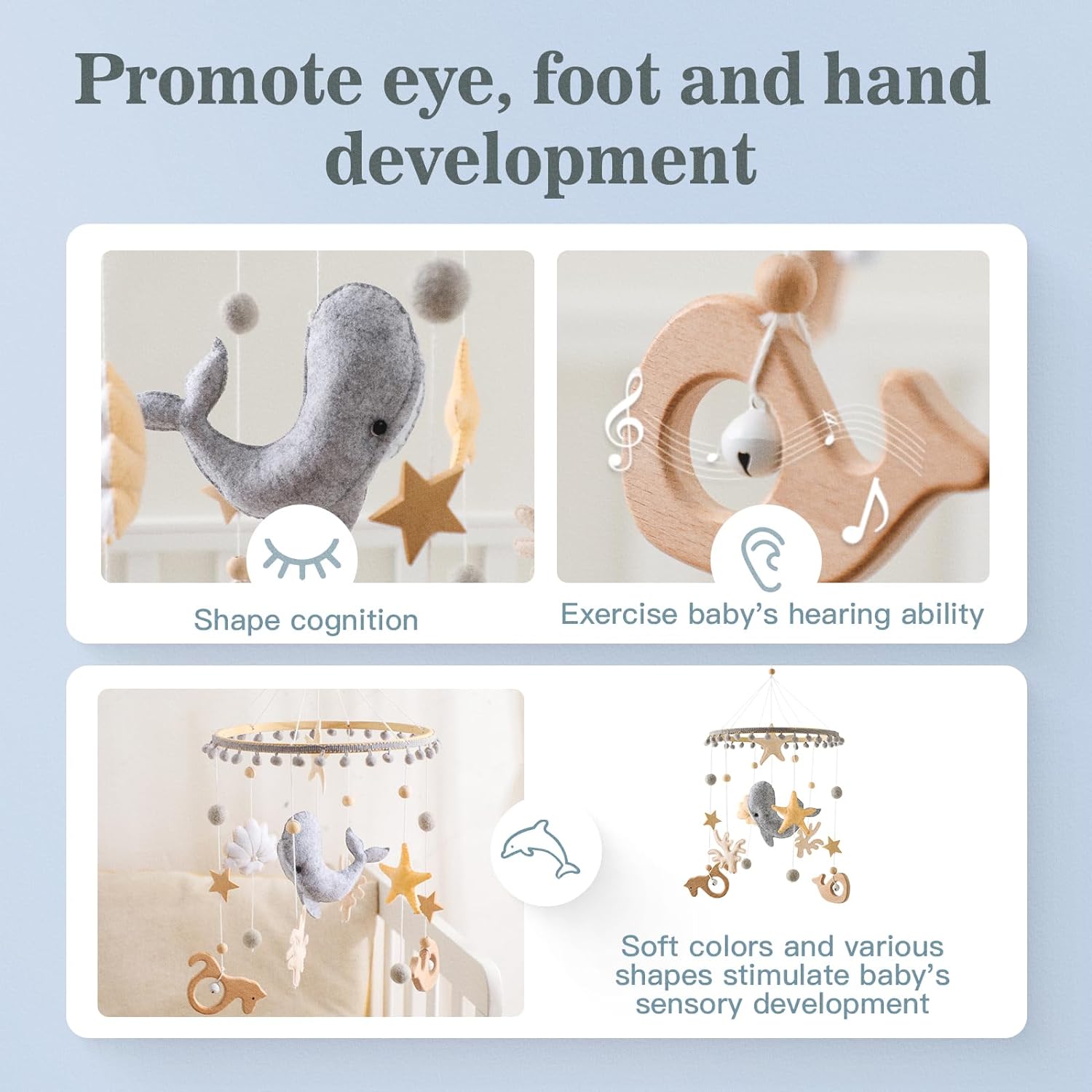 Estimulación visual y sensorial: Las figuras colgantes giran lentamente, captando la atención del bebé y estimulando su desarrollo visual.